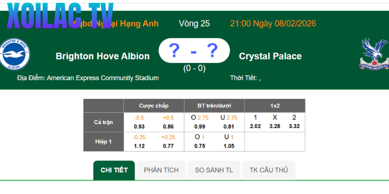 Trận cầu giữa Brighton & Hove Albion vs Crystal Palace vào ngày 08/02 tới đây xoilac hứa hẹn sẽ mang đậm dấu ấn chiến thuật của đội chủ nhà. Với phong độ chạm đáy, Crystal Palace khó lòng thoát khỏi một thất bại tại Amex.