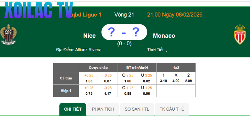 Bảng tỷ lệ kèo trận Nice – Monaco